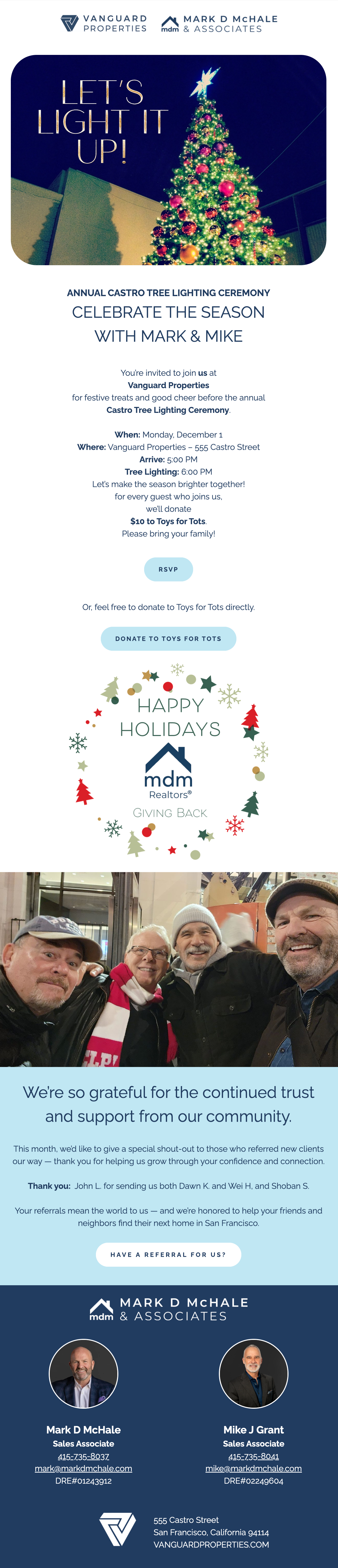 Email marketing was introduced as a new channel for Mark D McHale & Associates, activating an existing but unused mailing list of 450+ contacts. I established the foundational structure for newsletters and campaign emails, with clear sections for market insights, featured listings, and direct calls to action.