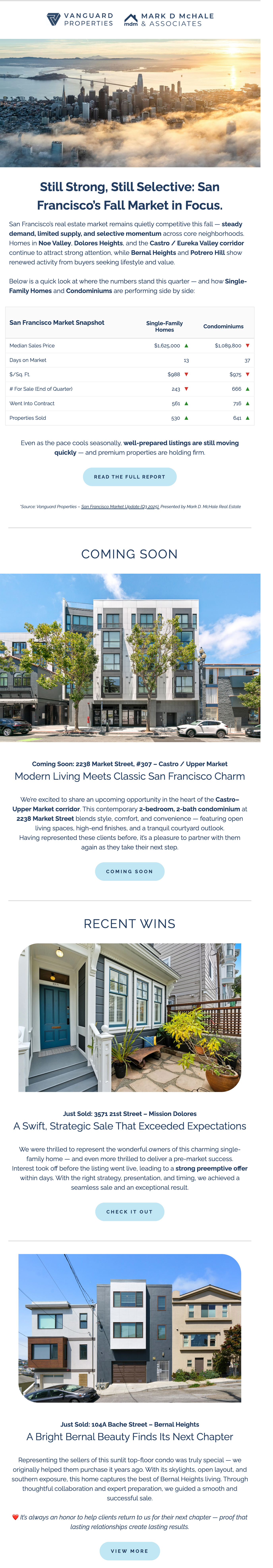 A full-funnel digital refresh designed to convert attention into conversations. I led a website redesign for a San Francisco Realtor team. I focused on clarity, speed, and lead capture, supported by a recurring email newsletter, SEO-driven blog content, and ongoing social media support. The system was built to scale, track performance, and support multiple property and neighborhood narratives without reinventing the wheel every time.